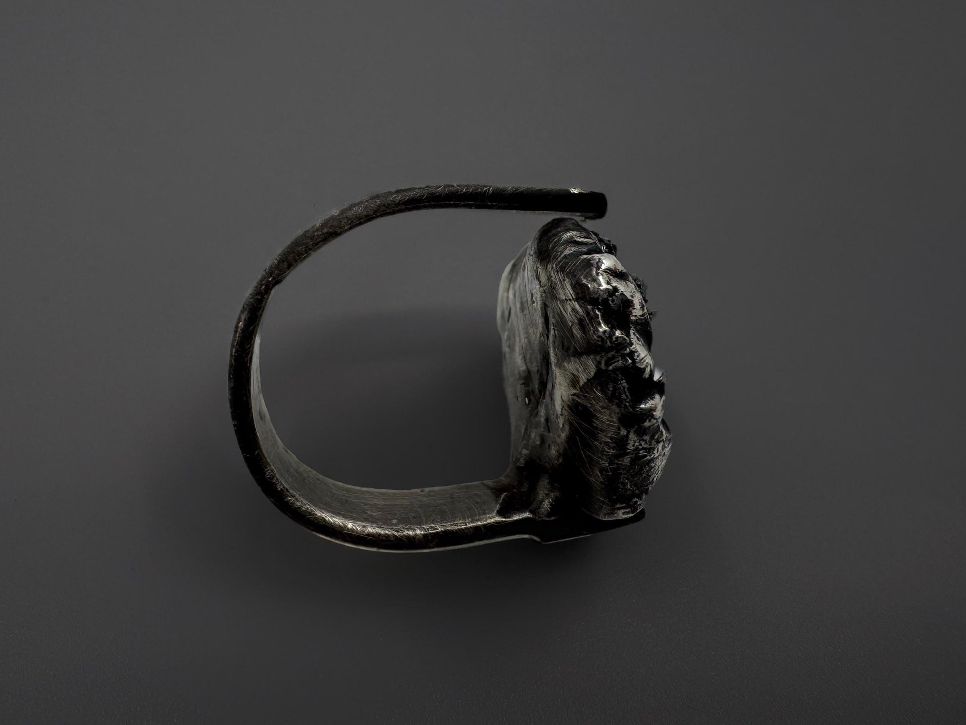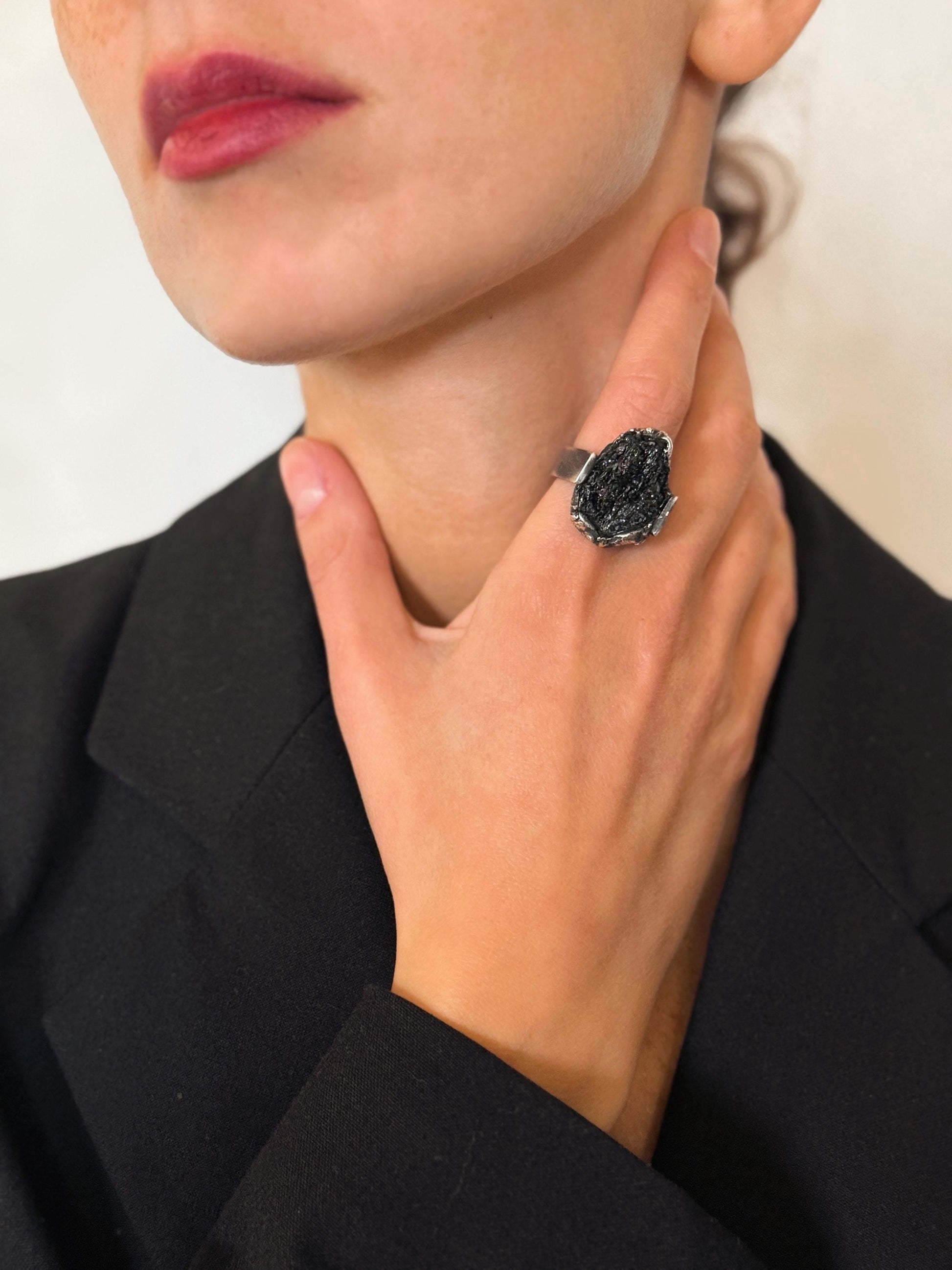 This black raw carborundum ring is handmade from oxidized sterling silver.